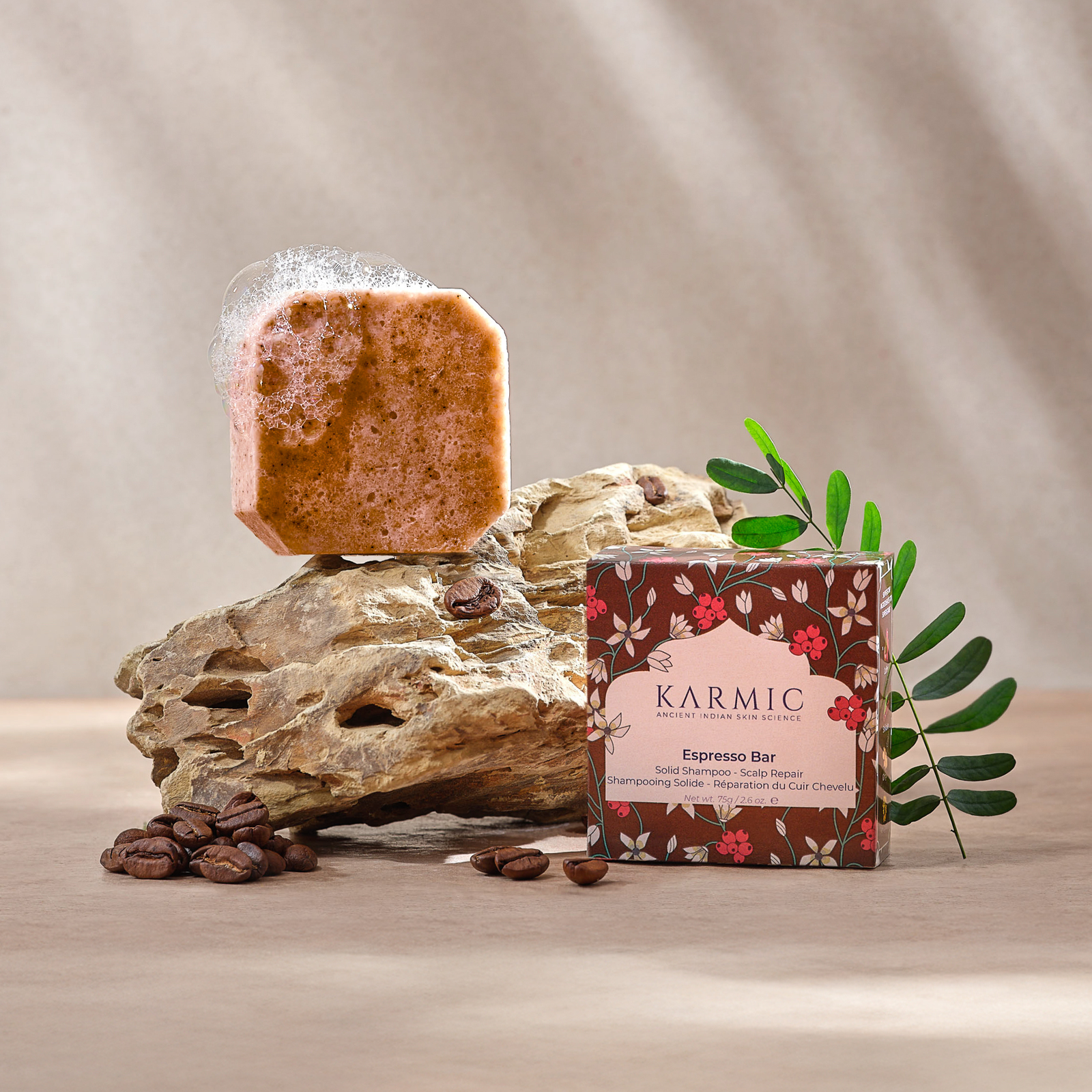Infused with stimulating Coffee Seed Oil and powered by ancient Ayurvedic herbs like Shikakai, Amla, and Fenugreek, this unique bar features fine coffee grounds that provide gentle exfoliation while creating a surprisingly rich, luxurious lather that gently lifts away product buildup, excess oils, and environmental toxins—without stripping your hair's natural moisture.